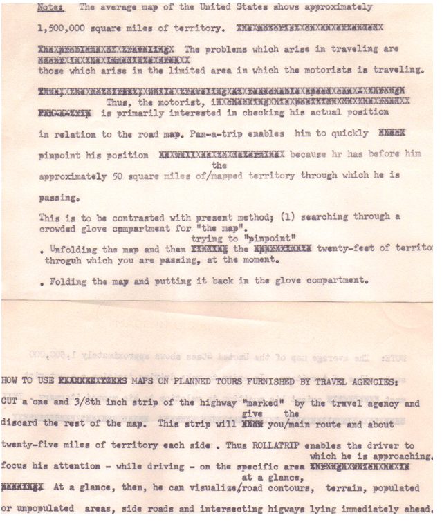 The paper was a description of a system he called Roll-a-Trip. He proposed cutting out the route in a one-inch strip. He would mount two spools across from each other on the steering wheel, wind the map strip around the left spool and stretch it under a magnifying glass to the right spool. As he traveled a certain number of miles, he would wind the map one inch. He would always have the 50 square miles of the road he was on right in front of him. He could keep track of where he was going without having to keep looking at a huge map. Rhode Island, the smallest state covered an area of over 1200 square miles while Texas, the largest state covered over 200,000 square miles. He described how he could mount a flashlight for night reading and how he could write names of hotels and restaurants on the map.