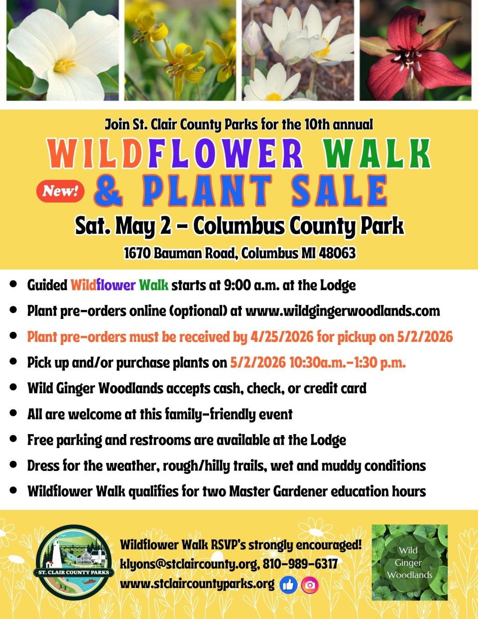During the free guided walk beginning at 9:00 a.m. at the Lodge, learn the secrets of spring ephemeral flowers and the habitats that harbor them. Ants, bees, and small mammals rely on these early bloomers for food and shelter, and photographers and plant lovers find them fascinating. Mary Kay Weber, naturalist and leader of the walk, said, “Columbus County Park is loaded with spring wildflowers along its wooded trails. I am excited to show them off and that people will be able to purchase some of these beauties after seeing them in their natural habitat.” All ages and abilities are welcome at this free and family-friendly event. Pre-registration is strongly encouraged. To register, contact Kirsten Lyons, klyons@stclaircounty.org, (810) 989-6317.