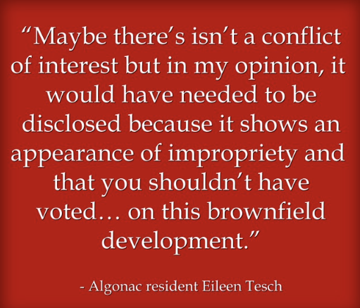 “My concern – and perhaps I missed it but I didn’t see anywhere that you disclosed – that you worked for or were associated with Corcat,” Tesch said. “Maybe there’s isn’t a conflict of interest but in my opinion, it would have needed to be disclosed because it shows an appearance of impropriety and that you shouldn’t have voted… on this Brownfield Development.”