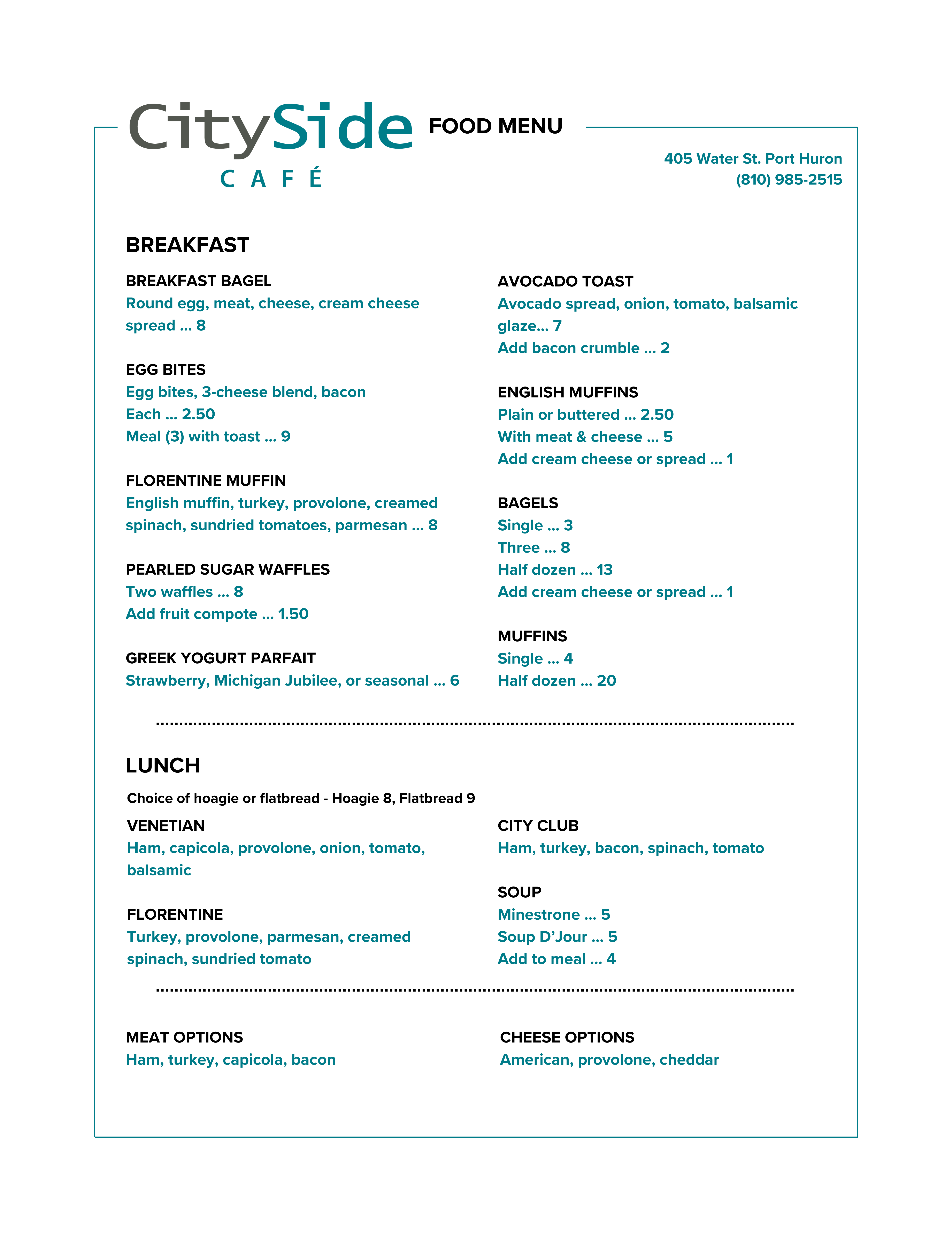 CitySide Café is located on the first floor of CityFlatsHotel at 800 Military St. in Port Huron and is open daily from 8 a.m. to 2 p.m.