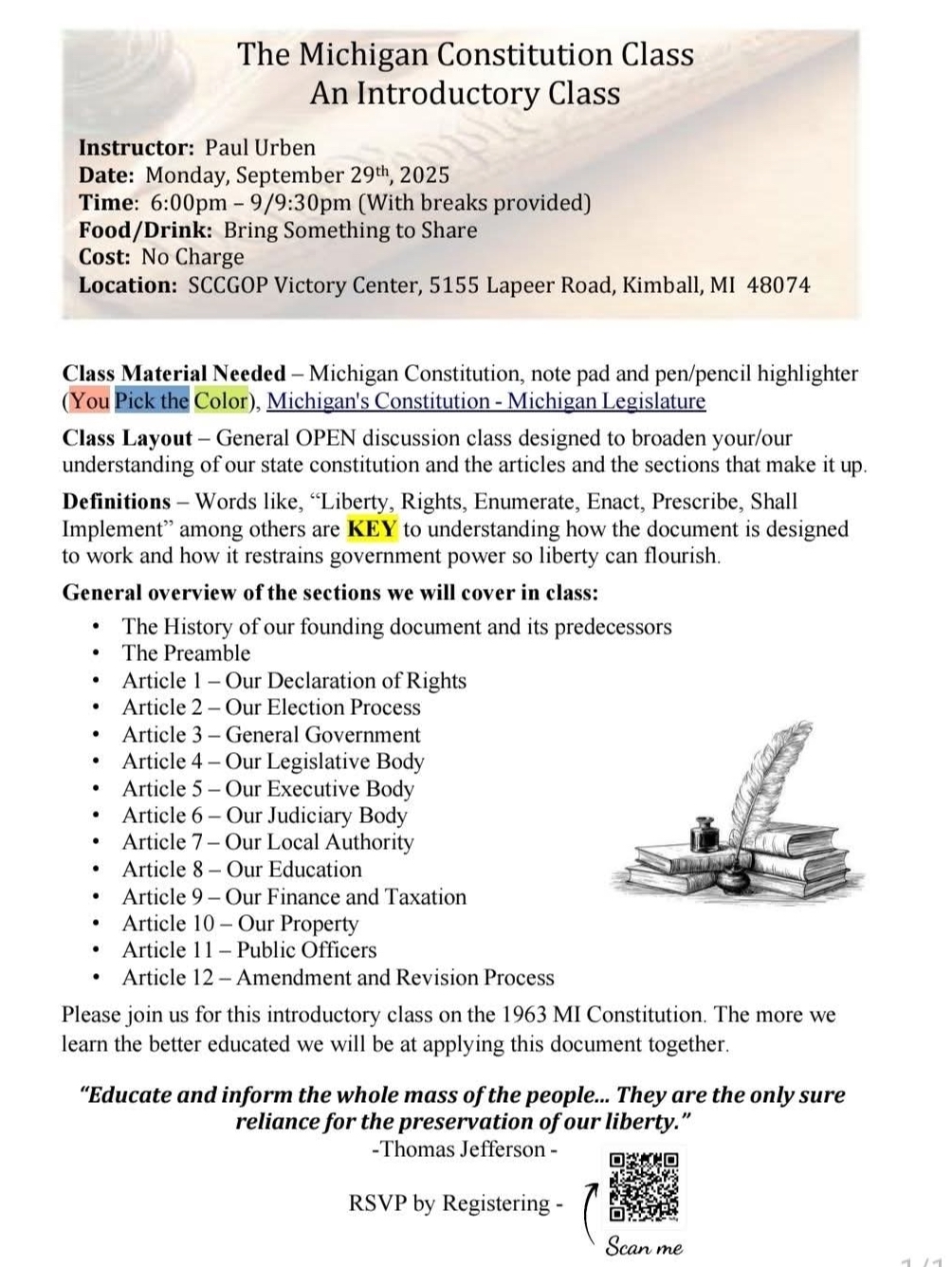 Paul Urben, St. Clair County’s local Constitutional expert, recently held an Introductory Class on The Michigan Constitution. Unfortunately, it was the first time that most of the attendees had ever read this critical document.