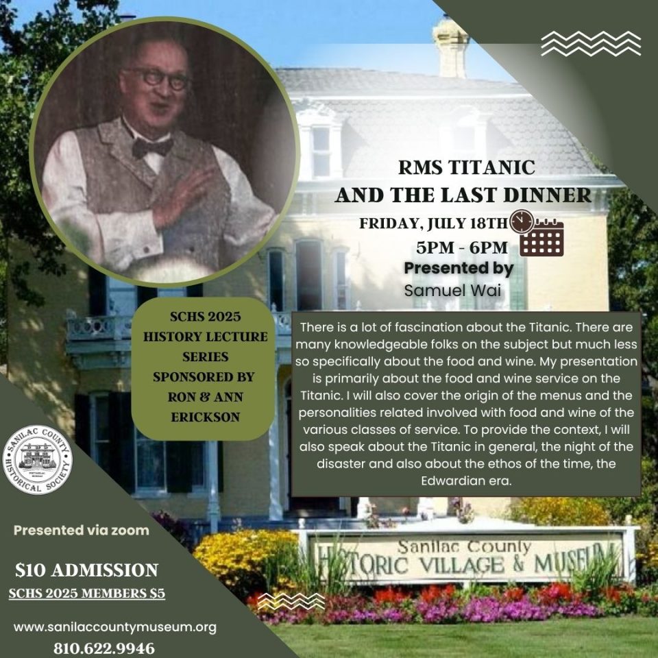 Sanilac County Historical Society continues its “Fridays at 5” history lecture series with a unique and fascinating virtual presentation by culinary historian and wine educator Samuel Wai, titled “The Last Meal on the Titanic.”