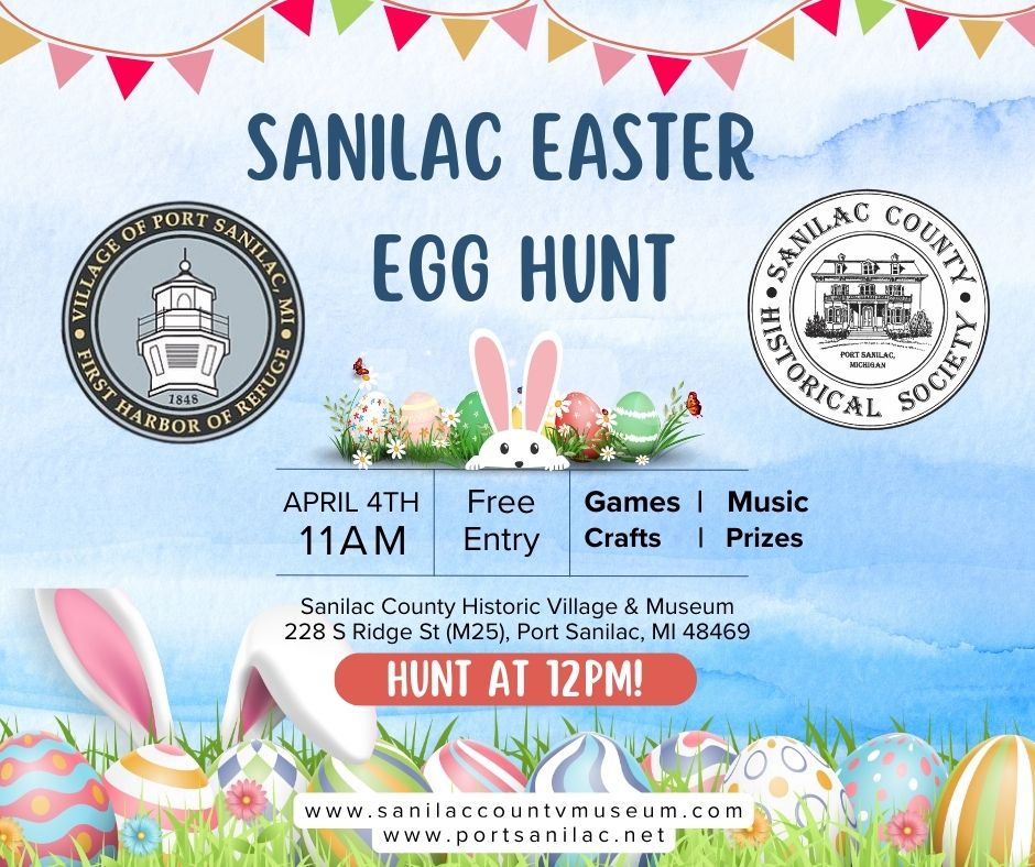 The Sanilac County Historical Society, in partnership with the Village of Port Sanilac Parks & Recreation, will host the 4th Annual Sanilac Community Easter Egg Hunt on Saturday, April 4, 2026, at the Sanilac County Historic Village & Museum.