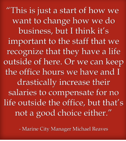 Marine City Manager Michael Reaves proposed a change in the hours at the city offices.