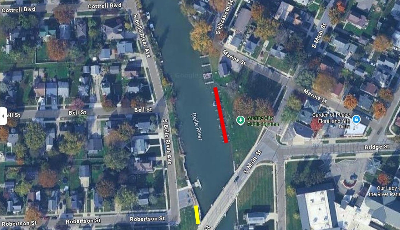 Adkins: The kayak launch has been pulled out and closed, but there is city owned seawall docking on the east side of the Belle River indicated in yellow. They are just south of the kayak launch. This is still transient docking as well, no overnight parking. Some or all of the docks at the marina may be closed periodically during active construction for safety and accessibility purposes.