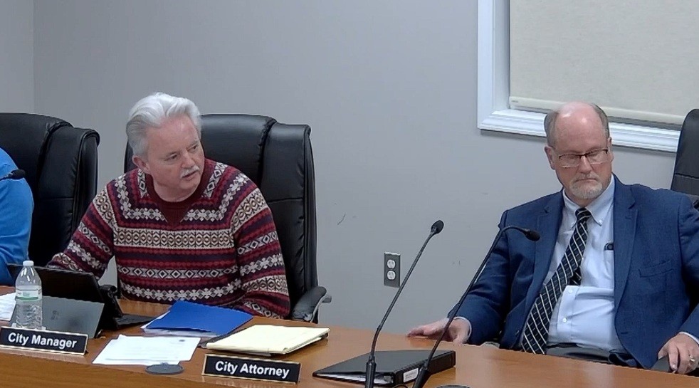 Marine City Manager Michael Reaves tells the city commission the goals for 2025 were either accomplished, exceeded or are ongoing at this time. City Attorney Robert Davis is pictured here on the right.