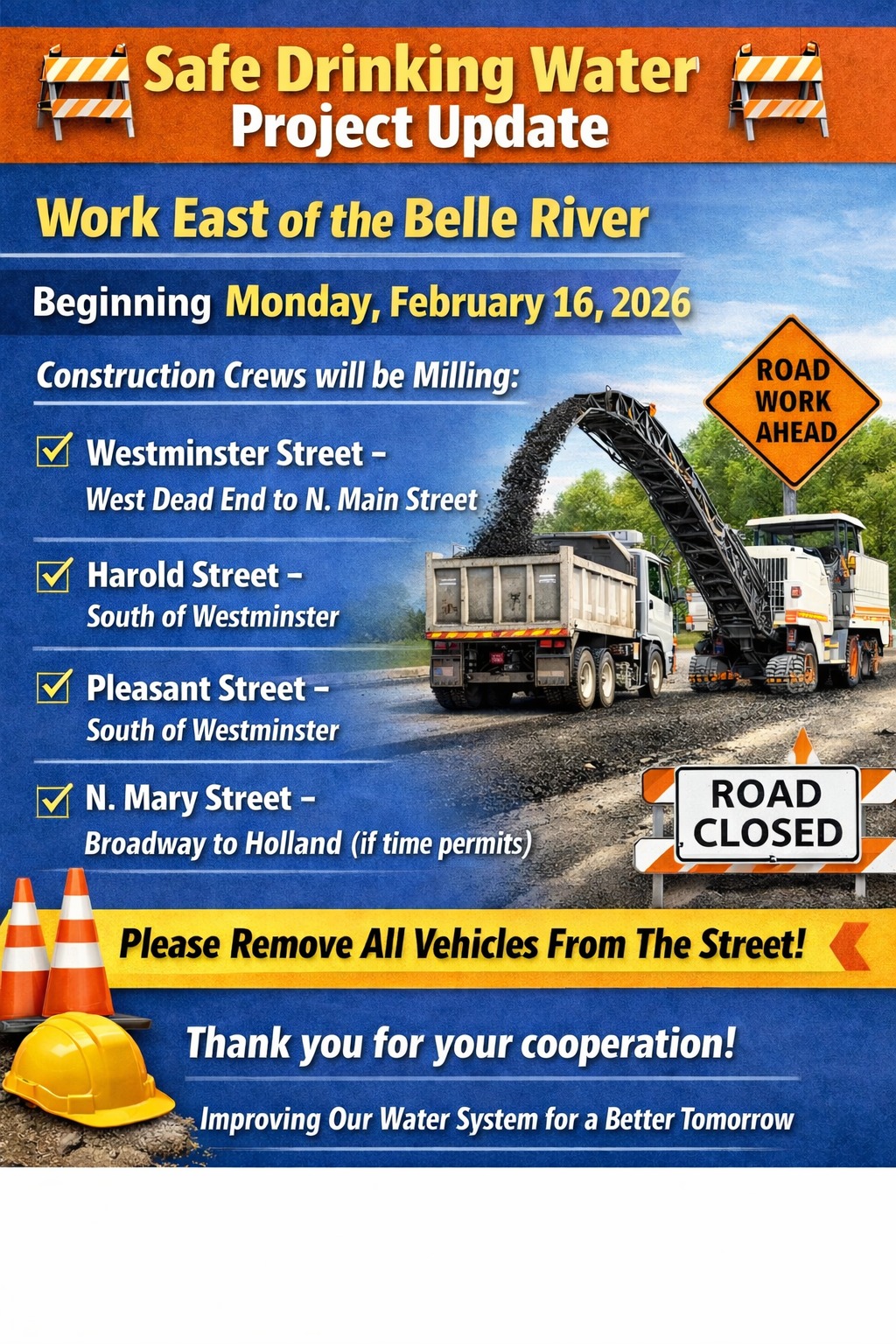 A notice on the City of Marine City Facebook page on Feb. 13 noted that work on the Safe Drinking Water Project is continuing in the city with the next phase of construction east of the Belle River.