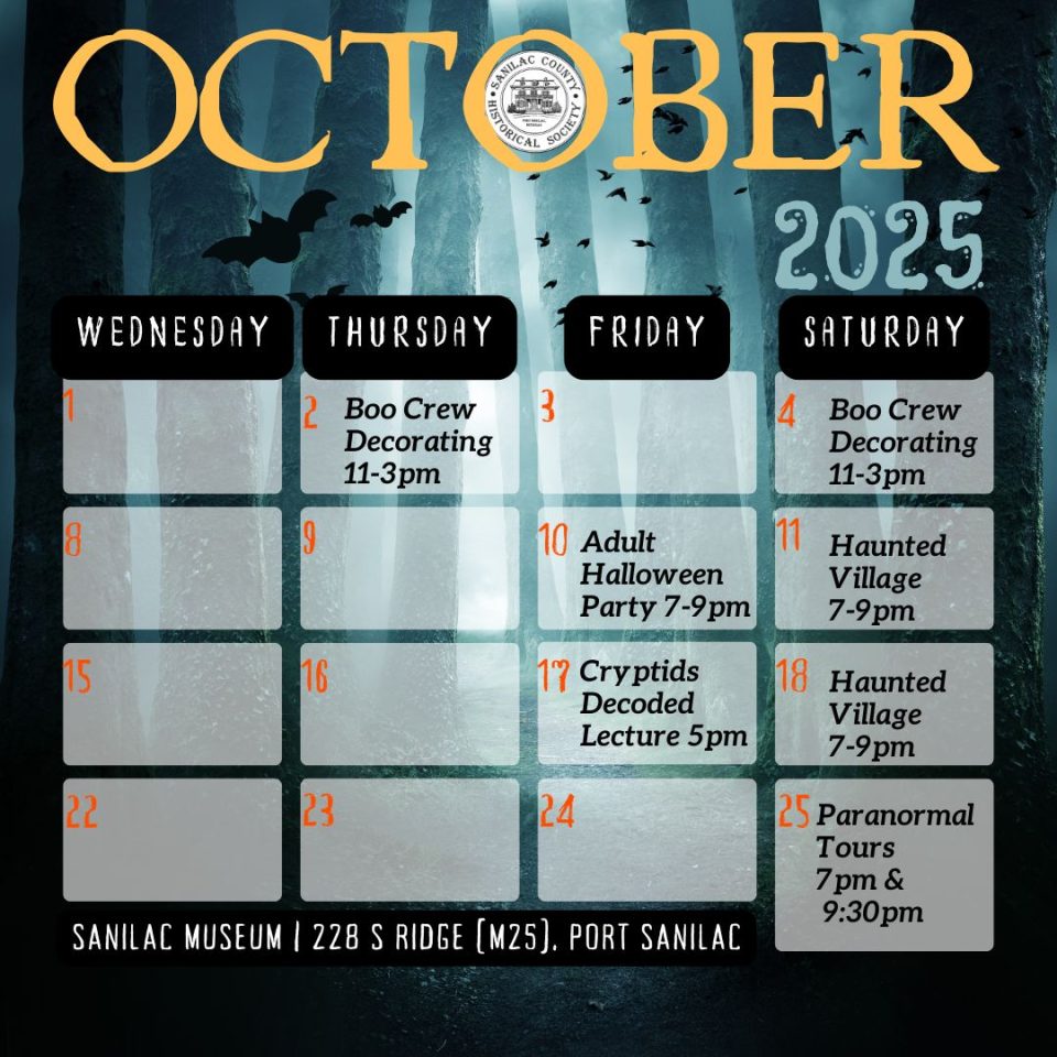 Port Sanilac, MI (August 29th, 2025) – This October, the Sanilac County Historic Village & Museum is transforming into the Thumb’s premier destination for Halloween thrills, family fun, and unforgettable history. From festive costume parties and family-friendly Haunted Village nights to lectures on legendary creatures and a chilling after dark paranormal investigation, there’s something for everyone to enjoy.