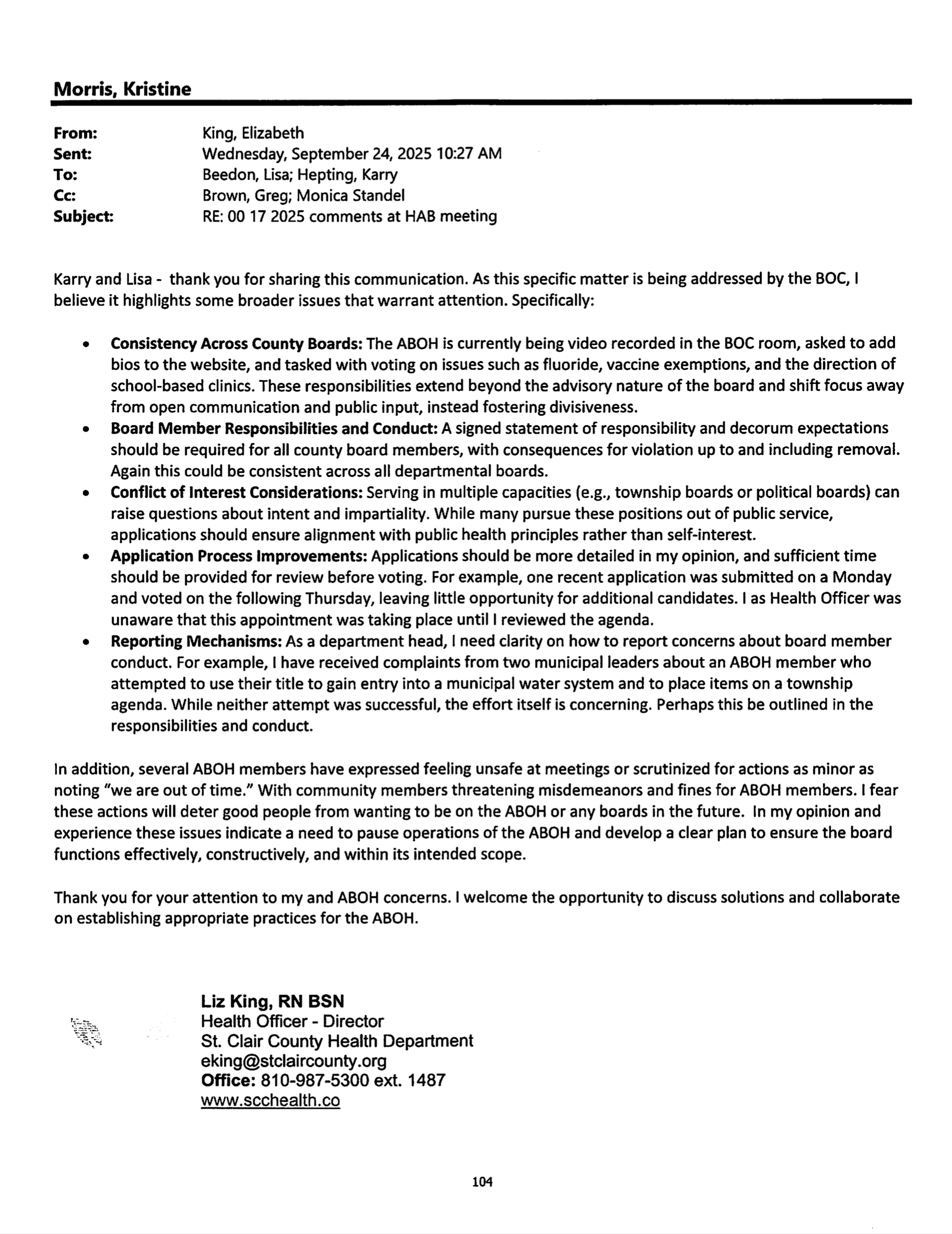 As the meeting was wrapping up with Board members’ comments, Health Director Liz King was confronted on an email that she sent out in September, 2025, to only a few County officials calling for a “pause of the Health Advisory Board.” One Marysville resident, Tracey Birgy, in her Public Comments questioned King’s explanation about her lack of transparency and intent.