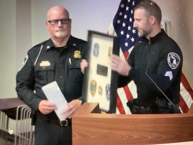 Sgt. Don Ennis presented Raker with a shadow box containing shoulder patches from four of the departments he has served.
