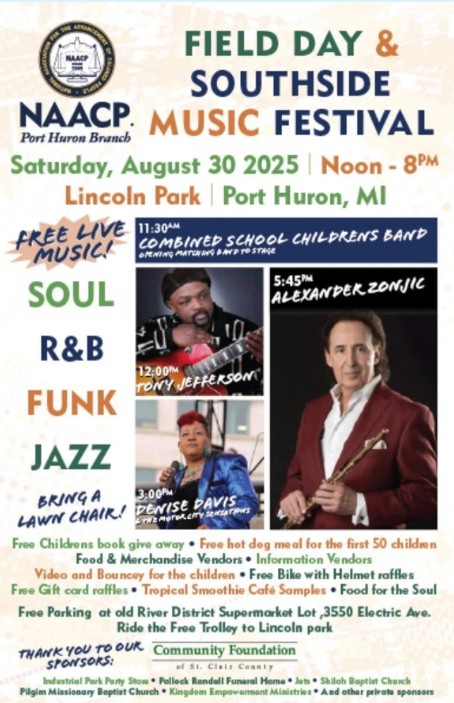 Presented by the NAACP Port Huron Branch this festival will include free live music including jazz, soul. R&B and Funk at Lincoln Park. Bring lawn chairs. Free hot dog meals to first 50 children, free children’s book give away, bounce houses, free bike and gift card raffles and lots of vendors.