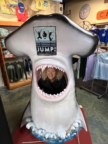 A tourist looking out the mouth of a fake hammerhead shark in a gift shop in Oak Bluffs.