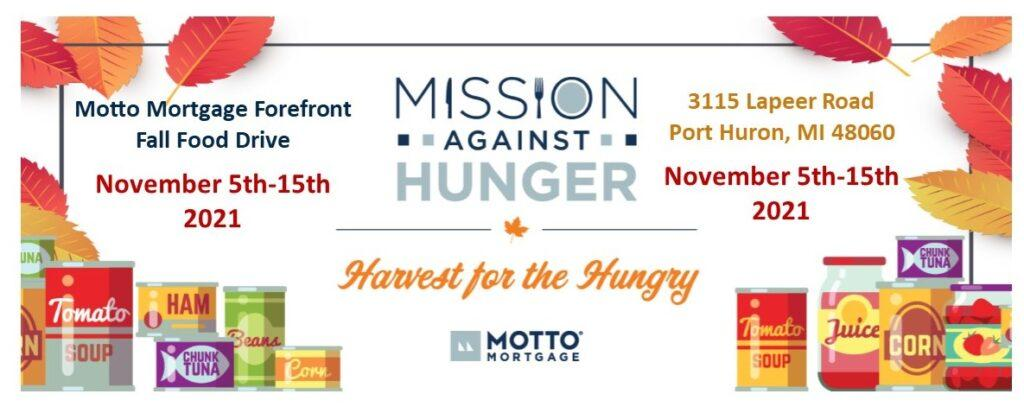 Motto Mortgage Forefront Fall Food Drive “Mission Against Hunger” will take place from November 5th-15th. If you have non perishable food items you would like to donate, you can drop them off at 3115 Lapeer Rd. in Port Huron. Items donated will be delivered to the Food Depot located on 10th Street in Port Huron.