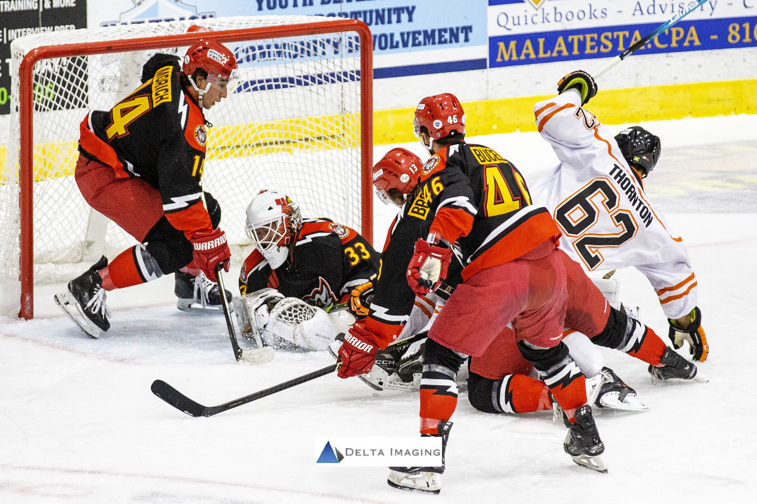 The Prowlers went on a defensive tear in the final 20 minutes allowing just three shots for the Scarecrows. Several dust ups took place including a strongly worded conversation between Topeka’s Head Coach Robbie Nichols and Port Huron’s Associate Head Coach Chris Paulin who both received 10-minute misconduct penalties, ejections and undisclosed fines after the game. Arttu Heikkila (3rd of the season) found his own rebound at the top of the crease with 1:57 left in regulation to seal the game as a W for the home team. Reggie Millette took the puck deep outside the slot on the left of Bernard but opted to feed Heikkila on the right for marker number three for Port Huron.