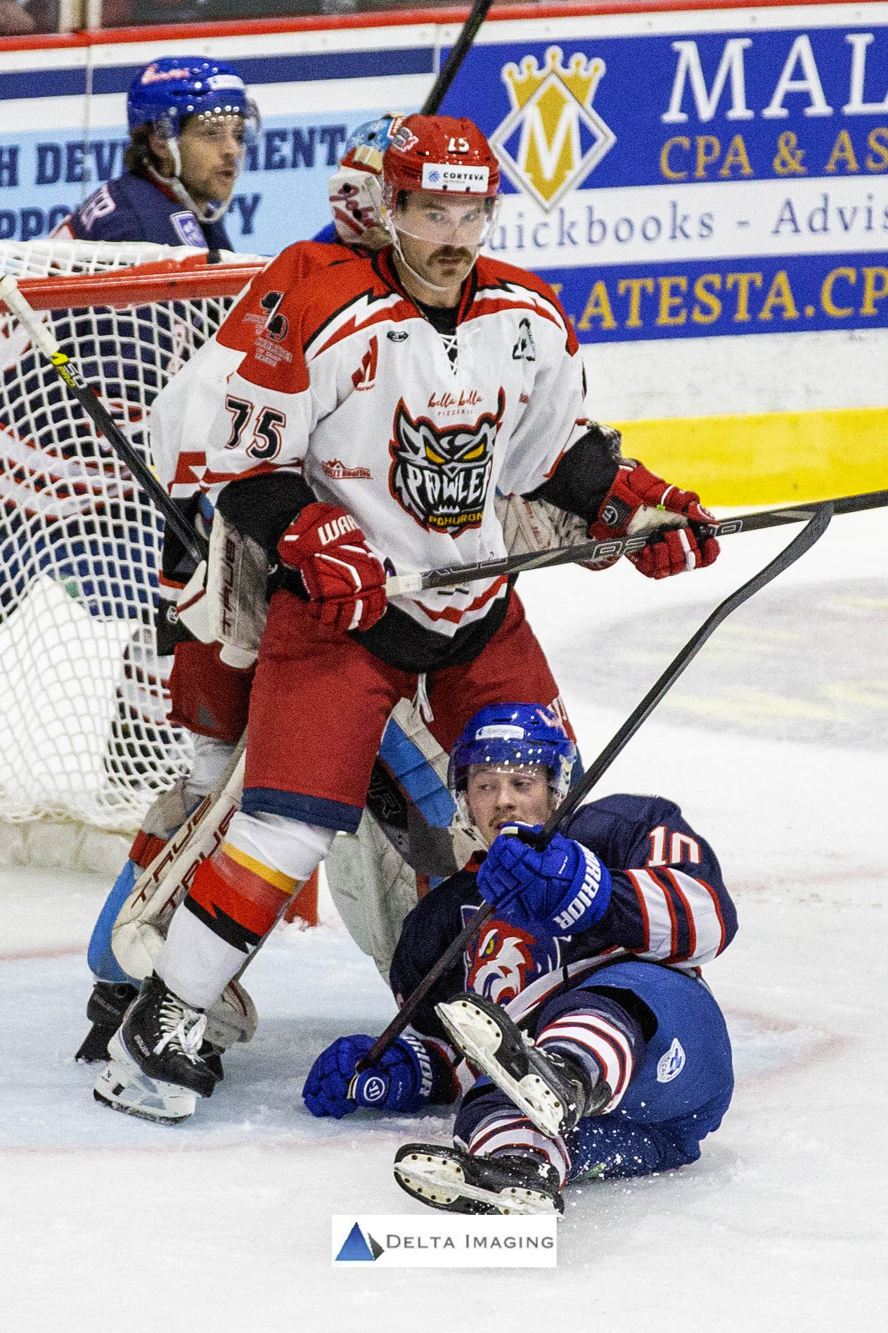 Four seconds into the game, Ben Brockway who had a fight Friday, squared up with former Prowler Dustin Henning who also fought Friday night. Brockway lost his footing as he came into Henning and just like that Paul Jene’s linesmen stepped in and called it done. At face off take two, Bryan Parsons and Zachary Ross picked up where the previous scuffle ended. Spinning in circles at center ice, the decision goes to Parsons. Third times a charm and the ensuing face off, started productive hockey.