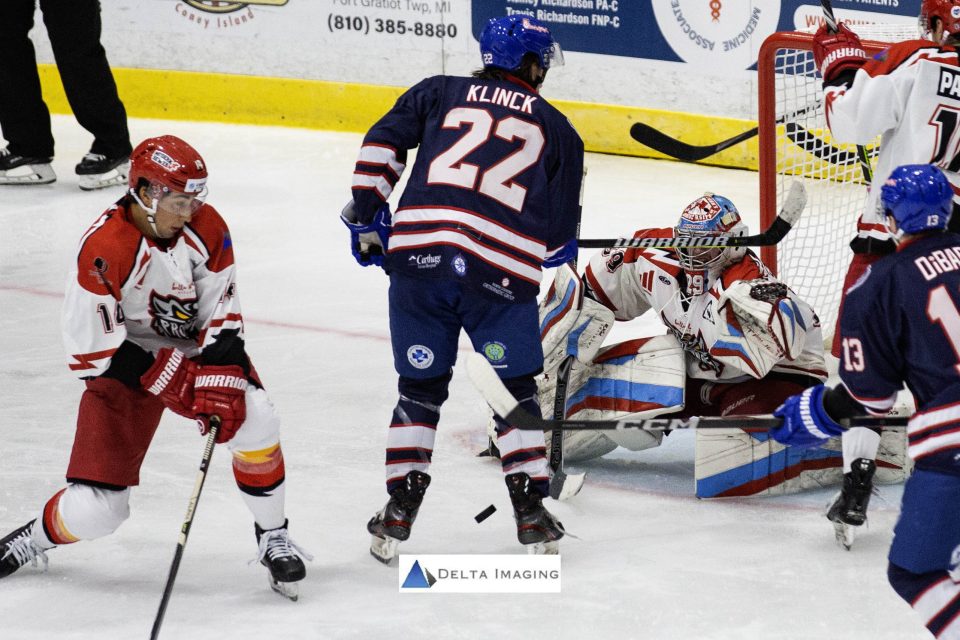 Dylan Marty (1st of the season) gained the Watertown zone and got tangled up with a defender as he tried putting the puck on net from the right side. His shot was blockered away by Breandan Colgan and was swept to the left-wing point. Ben Brockway in going to the net with the puck, put it right on Marty’s stick who easily tapped it past Colgan to put the Prowlers on top. Player Coach Alex Johnson drew a whistle for Hooking and Brad Reitter took advantage of the power play to even things up 1-1 at 12:21. Port Huron led 13-11 in shots on goal at the end of 20 minutes.