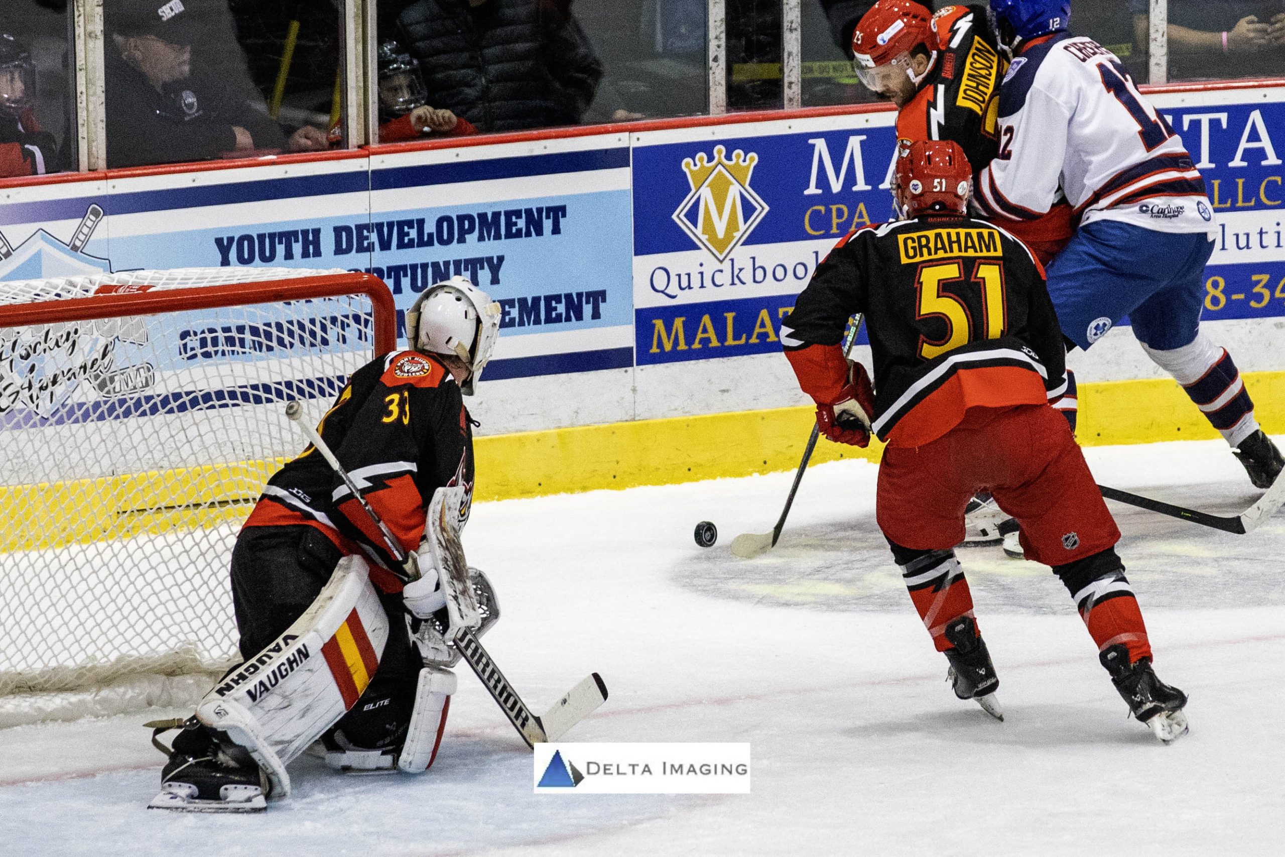 Watertown came out with hot twigs in the 3rd stanza. Egor Filippov and Darion Benchich tallied a goal apiece even strength at 1:38 and 4:00 respectively to stretch their team’s lead 4-1, before Nicholas Favaro (2nd of the season) got one back at 5:39. Graham scraped the puck out from behind the Wolves’ net where Favaro put it over Colgan’s stick side shoulder without him even seeing it go past. Ryan Gil capitalized on a Reggie Millet Holding minor at 8:15 for a power play goal and at 15:48 Filippov put in an empty net dagger to the Prowlers at 15:48. Shots for the period favored the Prowlers heavily 19-8 but they just couldn’t crack the net.