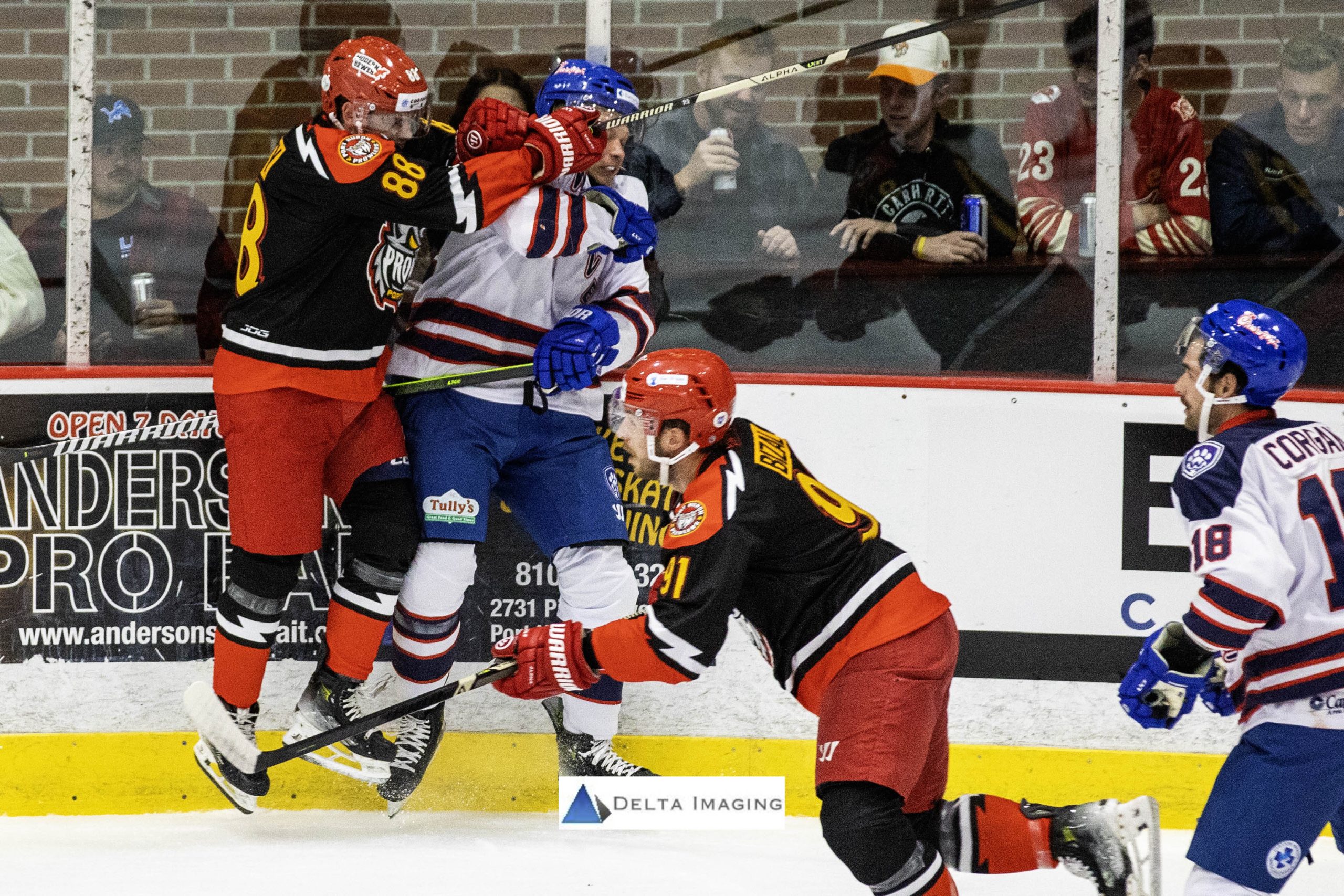 The middle frame saw Brad Reitter a former Motor City Rockers score on the powerplay at 3:29. Aartu Heikkila was serving a Cross-Checking minor. That’s when the penalty flood gates opened and opened wide. Mostly seemed against the Prowlers, which Associate Head Coach Chris Paulin addressed in his post-game presser. Ben Brockway, Player Coach Alex Johnson, Reggie Millette, Bryan Parsons, and Luke James would all serve 2 minutes for minors, Johnson would also collect a 10 misconduct for Abuse of Officials, Brockway would add another minor and a Fighting major, Captain Austin Fetterly and Player Coach Matt Graham would get into fisticuffs and draw Fighting majors as well. After 40 minutes of play, the Wolves held a 2-1 lead and put up 14-5 shots on goal.